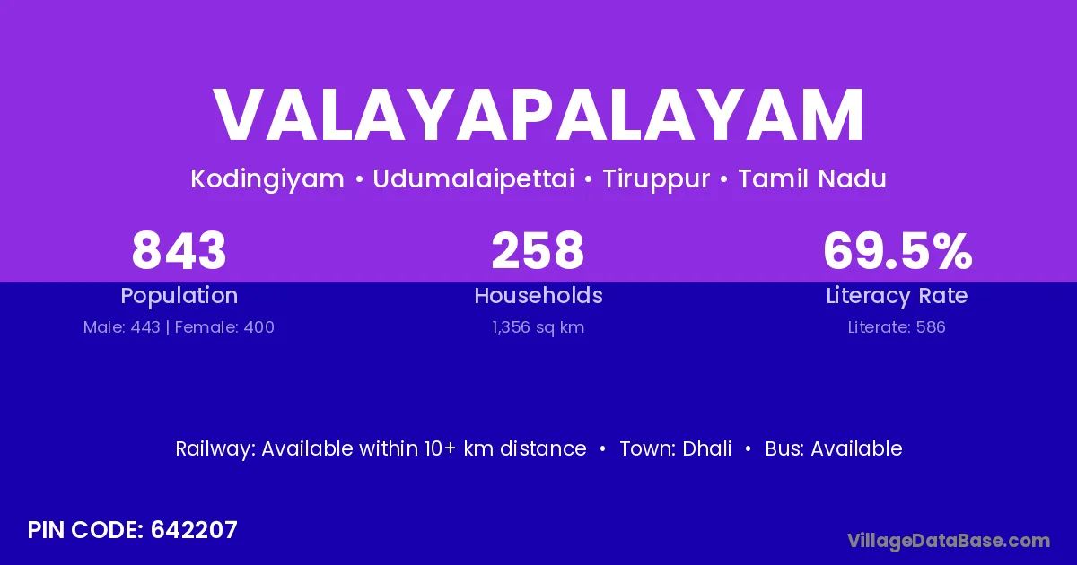 The literacy rate of Valayapalayam village is 73.89%. Male literacy stands at 81.07% and female literacy at 66.67%.