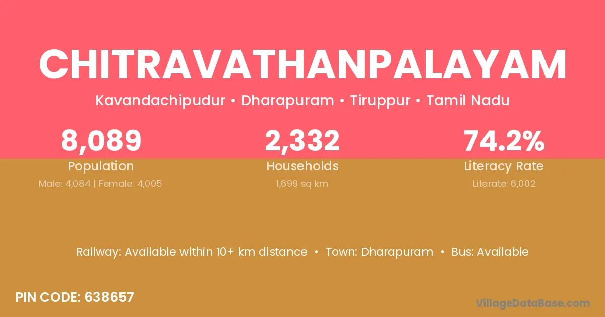 Chitravathanpalayam village has a total population of 8,089 people, of which 4,084 are males and 4,005 are females.