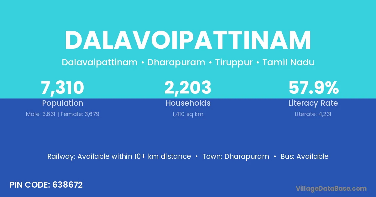 Dalavoipattinam village has a total population of 7,310 people, of which 3,631 are males and 3,679 are females.