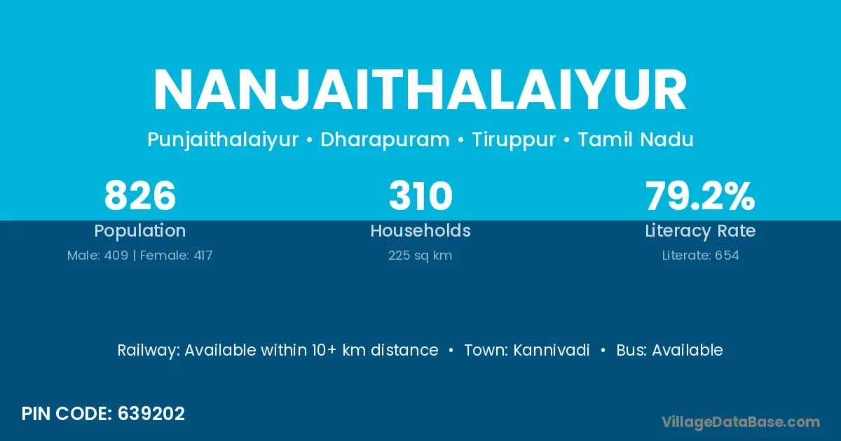 Nanjaithalaiyur village has a total population of 826 people, of which 409 are males and 417 are females.