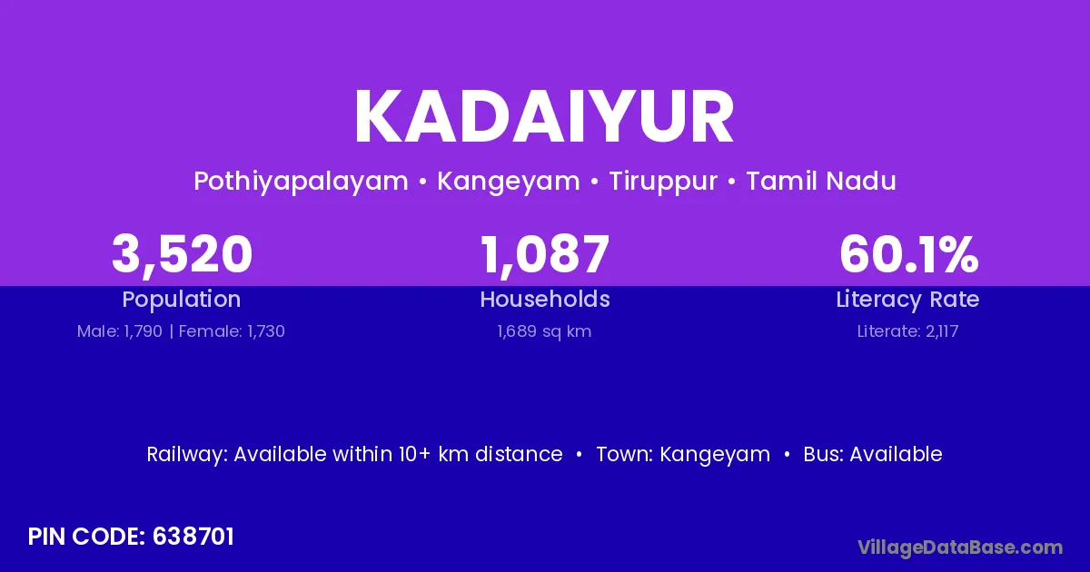 Kangeyam is the nearest town to Kadaiyur village for major economic activities