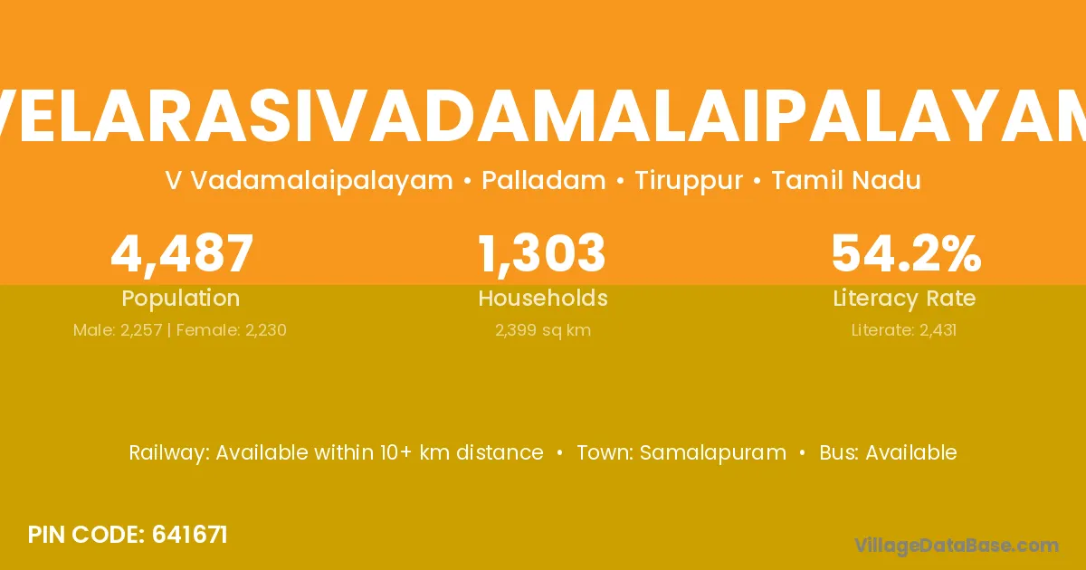 Velarasivadamalaipalayam village has a total population of 4,487 people, of which 2,257 are males and 2,230 are females.