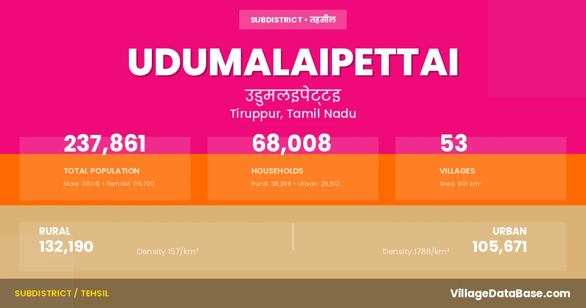 According to the 2011 census The total area of Udumalaipettai Taluka is 901 km², with a population of 237861 people. The population density is 264 inhabitants per square kilometre, and there are approximately 68008 houses in the sub district.