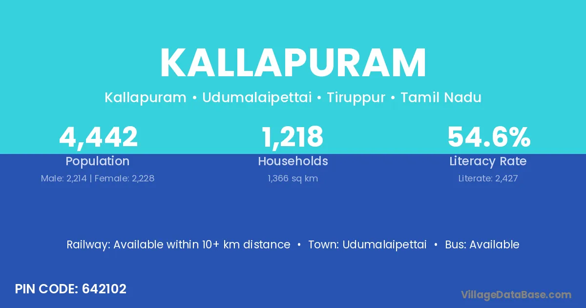 Kallapuram village has a total population of 4,442 people, of which 2,214 are males and 2,228 are females.