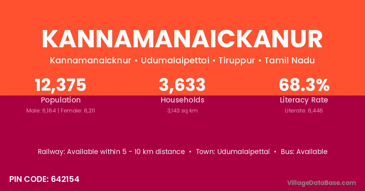 Kannamanaickanur village has a total population of 12,375 people, of which 6,164 are males and 6,211 are females.