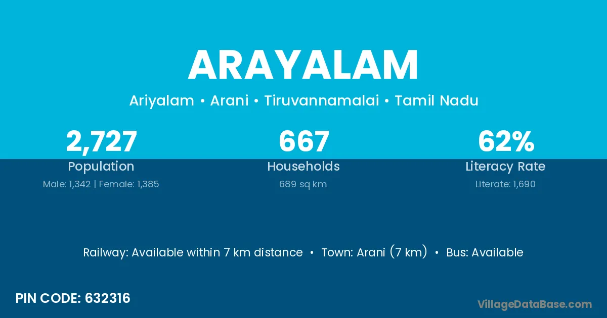 Arani (7 km) is the nearest town to Arayalam village for major economic activities and is located approximately 7 km away.