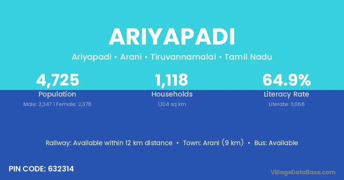 Arani (9 km) is the nearest town to Ariyapadi village for major economic activities and is located approximately 9 km away.