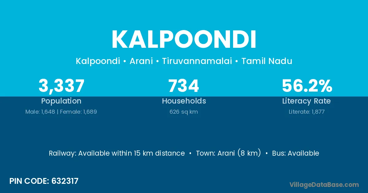 Arani (8 km) is the nearest town to Kalpoondi village for major economic activities and is located approximately 8 km away.