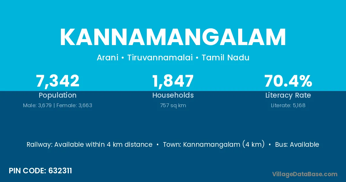 Kannamangalam village has a total population of 7,342 people, of which 3,679 are males and 3,663 are females.