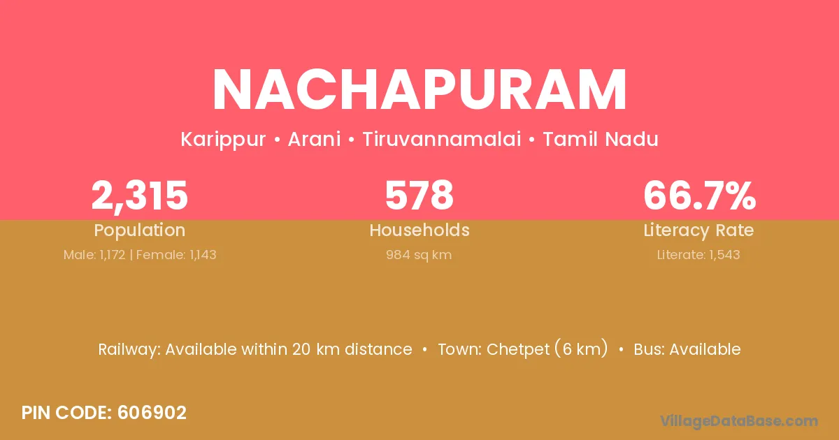 Chetpet (6 km) is the nearest town to Nachapuram village for major economic activities and is located approximately 6 km away.