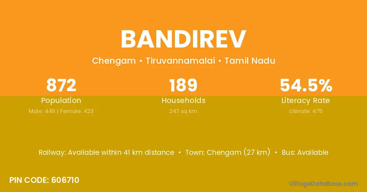 Chengam (27 km) is the nearest town to Bandirev village for major economic activities and is located approximately 27 km away.