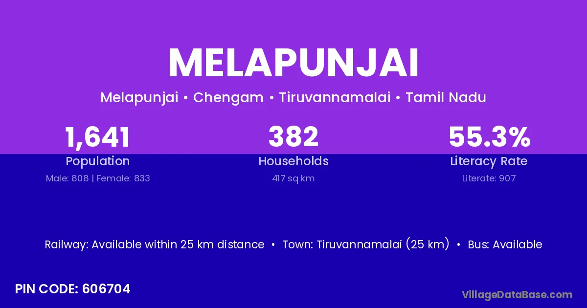 Tiruvannamalai (25 km) is the nearest town to Melapunjai village for major economic activities and is located approximately 25 km away.