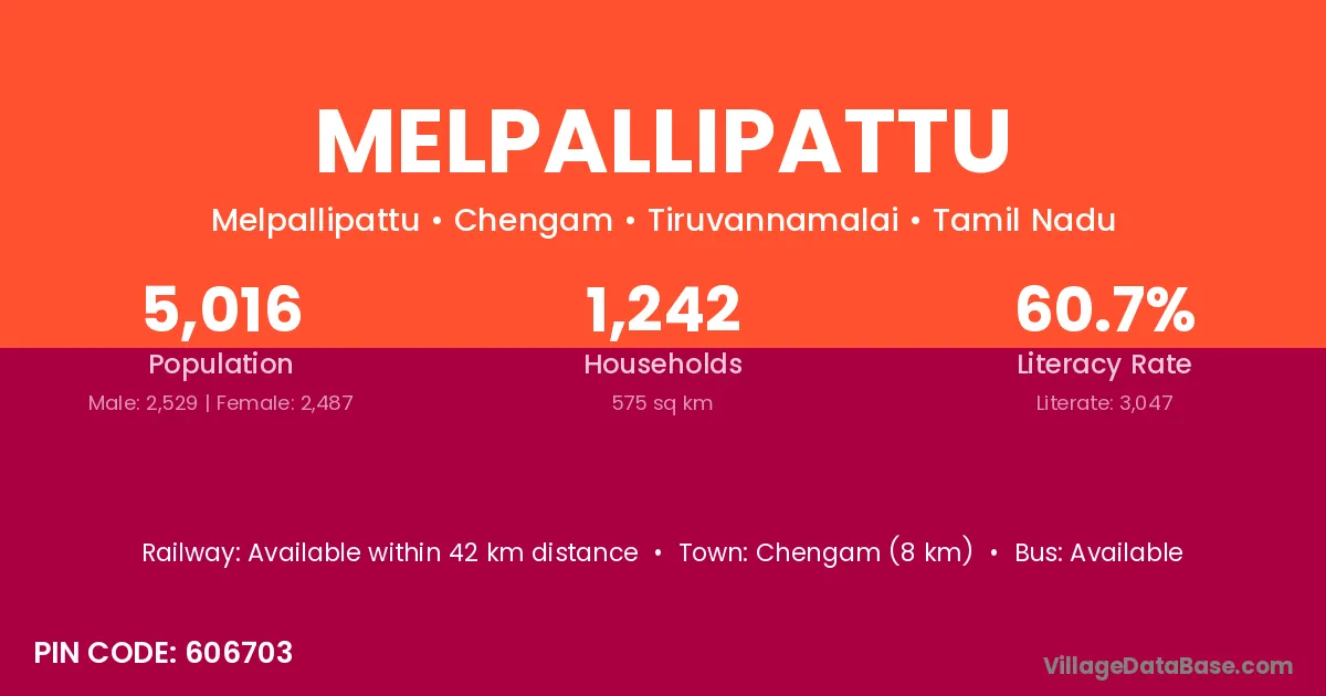Chengam (8 km) is the nearest town to Melpallipattu village for major economic activities and is located approximately 8 km away.