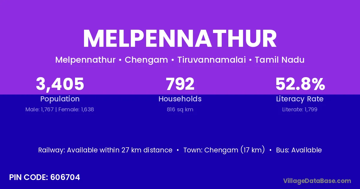 Chengam (17 km) is the nearest town to Melpennathur village for major economic activities and is located approximately 17 km away.