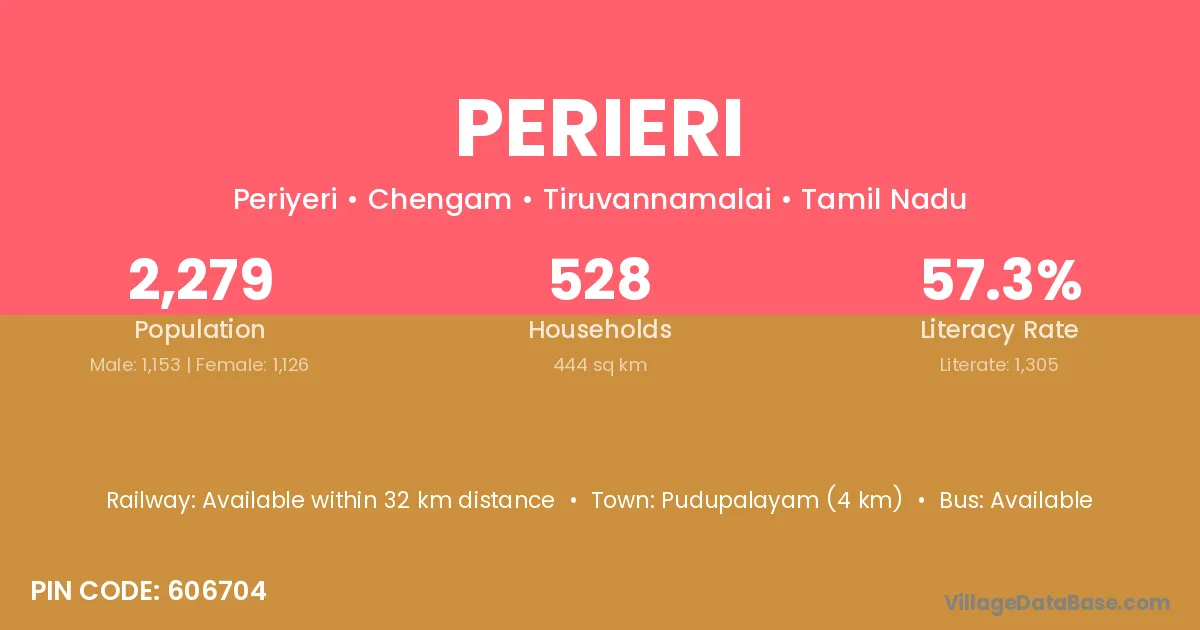 Pudupalayam (4 km) is the nearest town to Perieri village for major economic activities and is located approximately 4 km away.