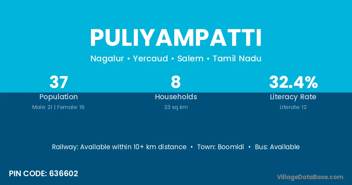 The literacy rate of Puliyampatti village is 51.63%. Male literacy stands at 58.81% and female literacy at 44.18%.
