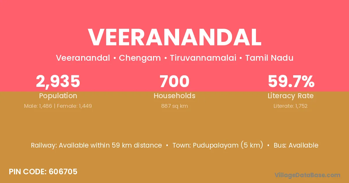Pudupalayam (5 km) is the nearest town to Veeranandal village for major economic activities and is located approximately 5 km away.