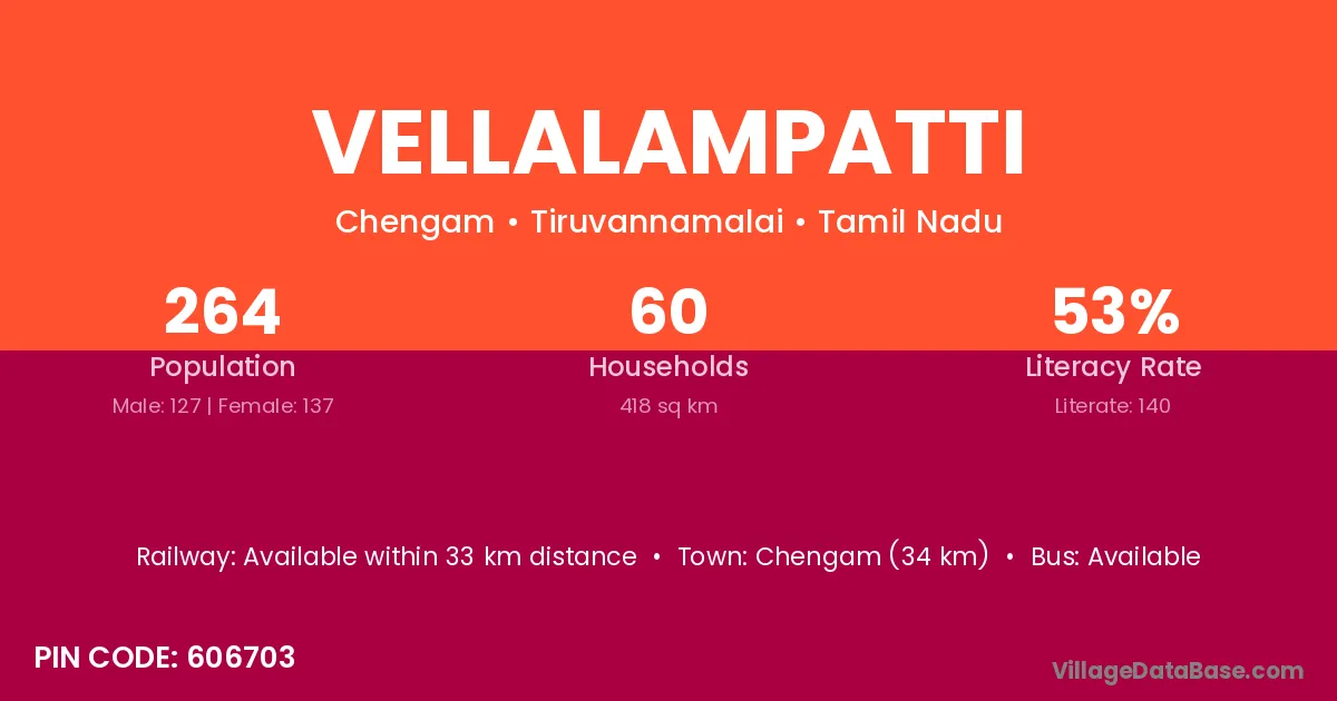 Chengam (34 km) is the nearest town to Vellalampatti village for major economic activities and is located approximately 34 km away.
