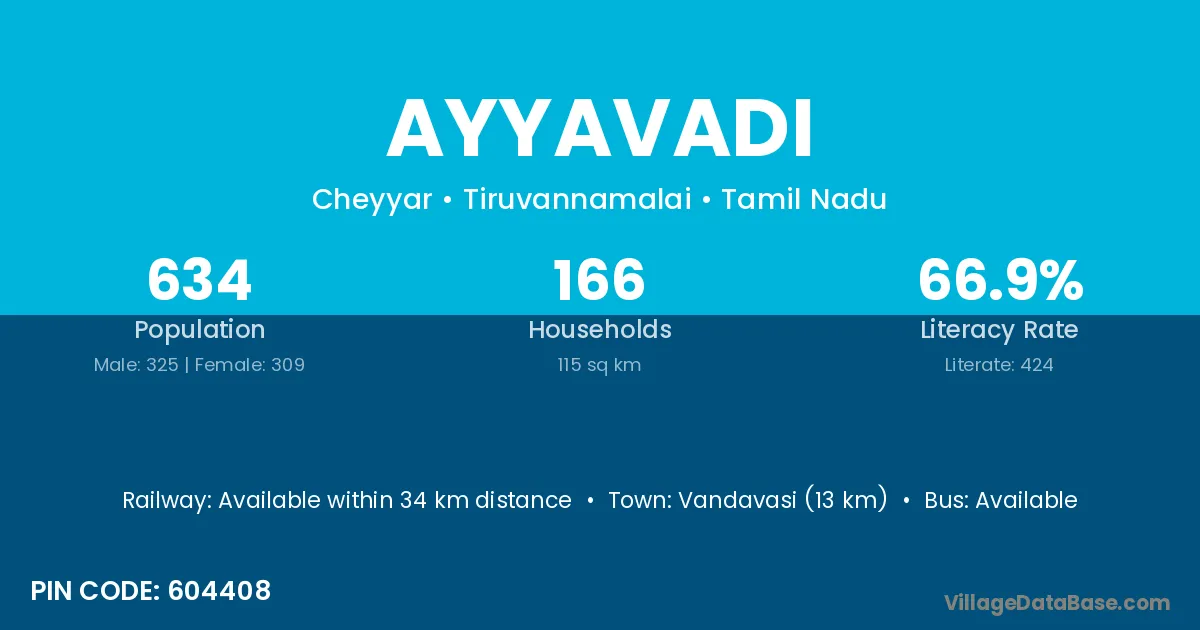 Vandavasi (13 km) is the nearest town to Ayyavadi village for major economic activities and is located approximately 13 km away.