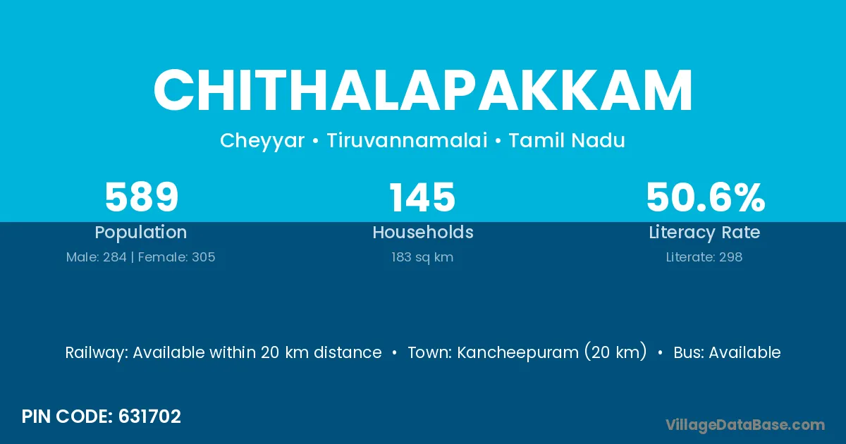 Kancheepuram (20 km) is the nearest town to Chithalapakkam village for major economic activities and is located approximately 20 km away.