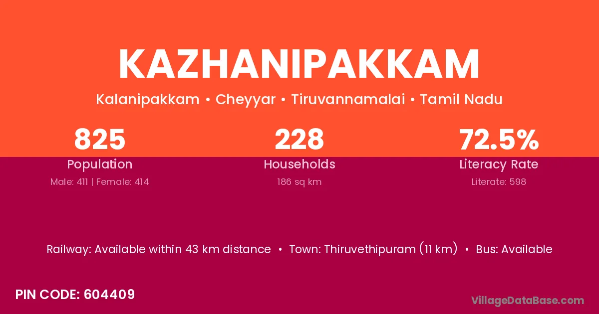 Thiruvethipuram (11 km) is the nearest town to Kazhanipakkam village for major economic activities and is located approximately 11 km away.