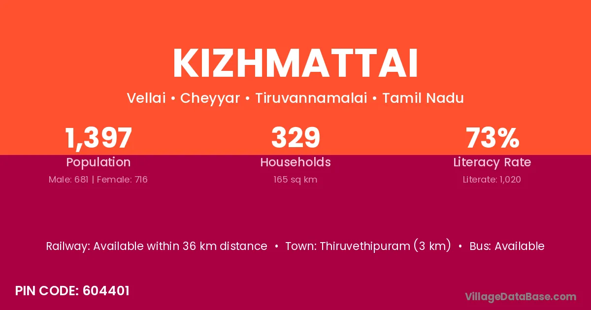Kizhmattai village has a total population of 1,397 people, of which 681 are males and 716 are females.