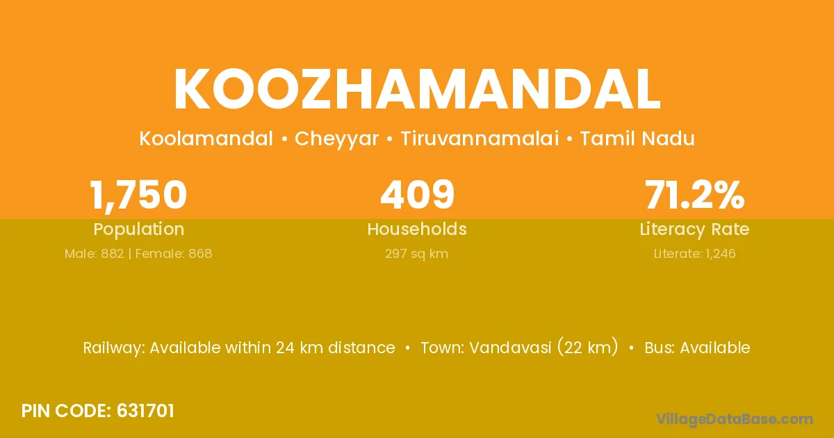 Vandavasi (22 km) is the nearest town to Koozhamandal village for major economic activities and is located approximately 22 km away.