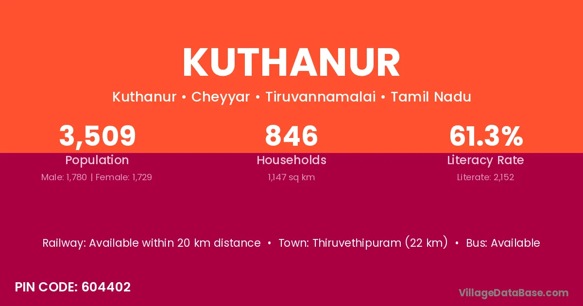 Thiruvethipuram (22 km) is the nearest town to Kuthanur village for major economic activities and is located approximately 22 km away.