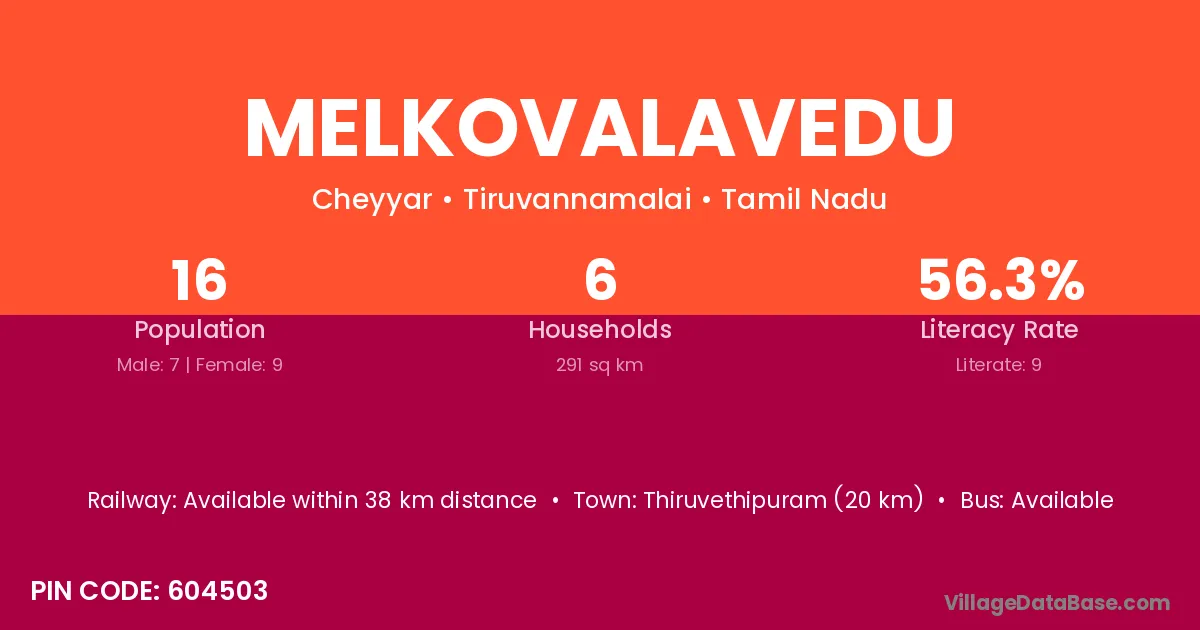 Melkovalavedu village has a total population of 16 people, of which 7 are males and 9 are females.