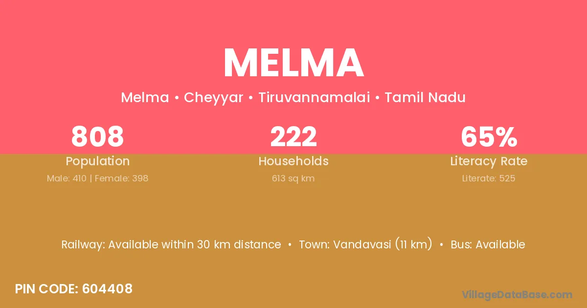 Vandavasi (11 km) is the nearest town to Melma village for major economic activities and is located approximately 11 km away.