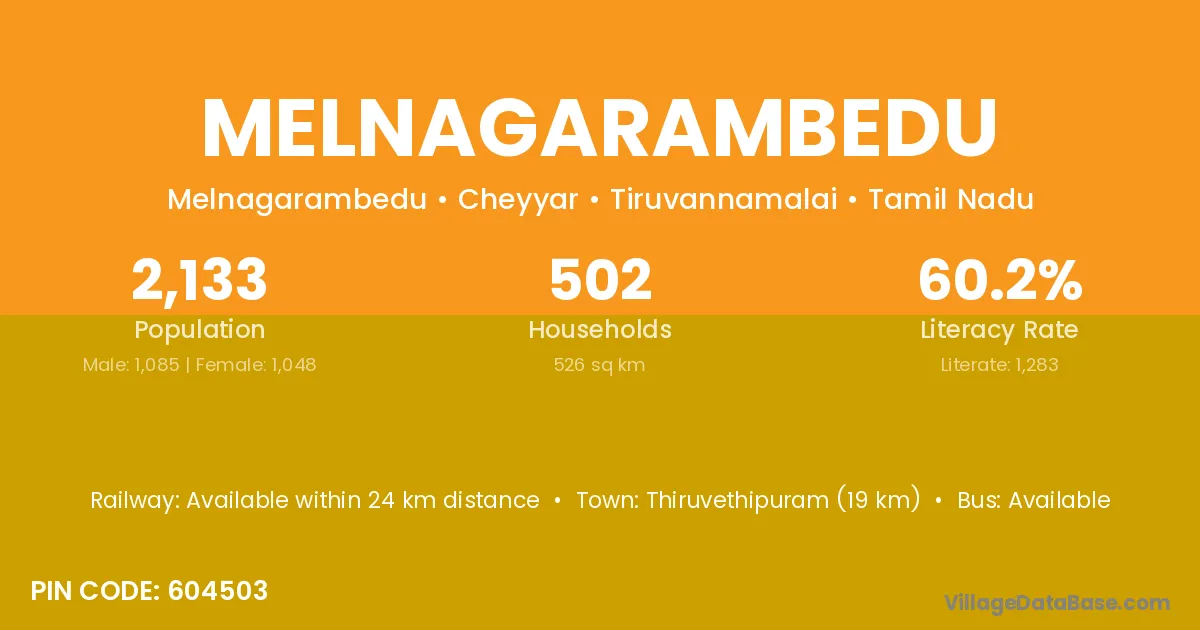 Thiruvethipuram (19 km) is the nearest town to Melnagarambedu village for major economic activities and is located approximately 19 km away.