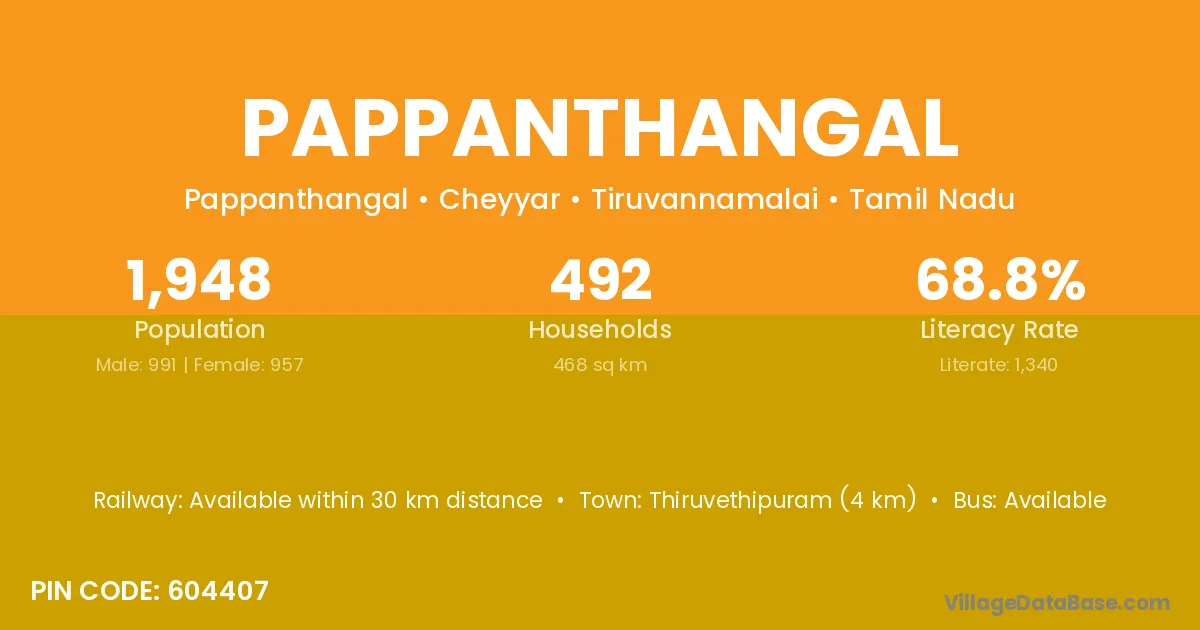 Thiruvethipuram (4 km) is the nearest town to Pappanthangal village for major economic activities and is located approximately 4 km away.