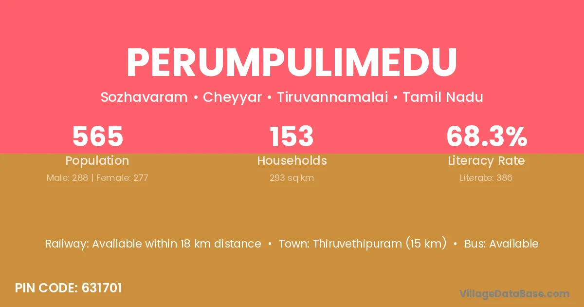 Thiruvethipuram (15 km) is the nearest town to Perumpulimedu village for major economic activities and is located approximately 15 km away.