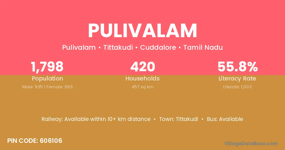 Thiruvethipuram (30 km) is the nearest town to Pulivalam village for major economic activities and is located approximately 30 km away.