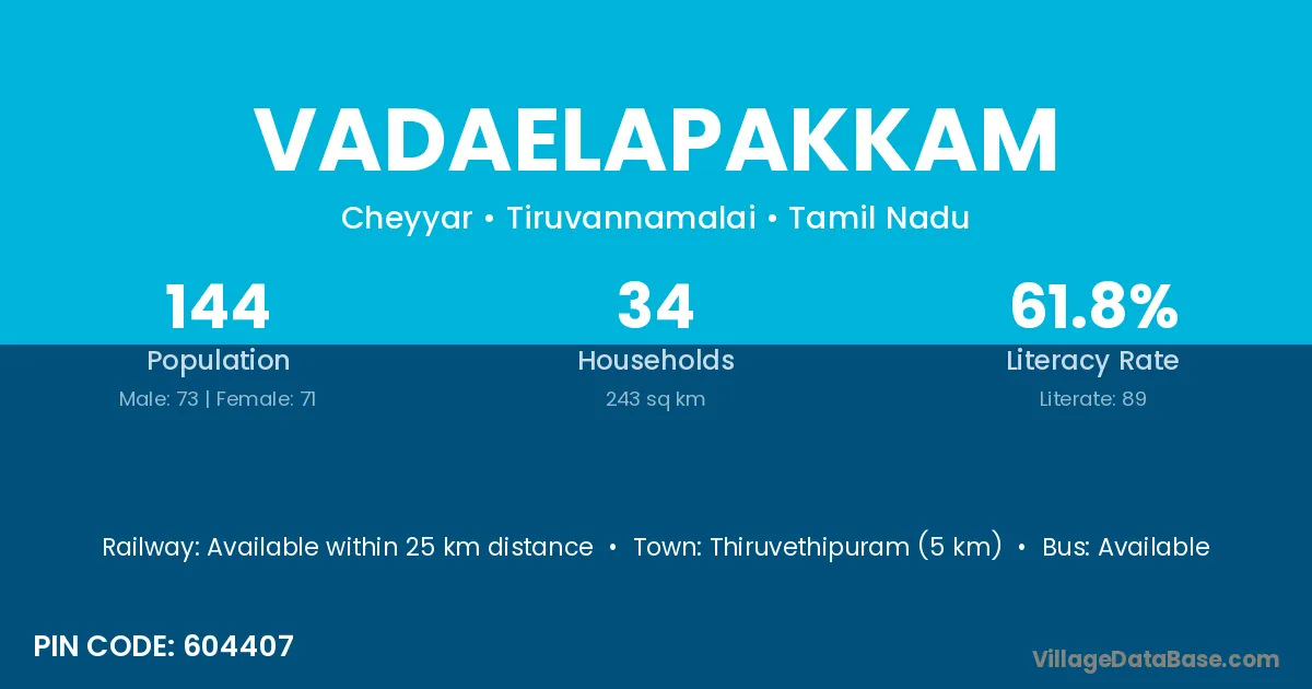 Thiruvethipuram (5 km) is the nearest town to Vadaelapakkam village for major economic activities and is located approximately 5 km away.