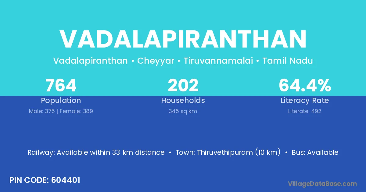 Thiruvethipuram (10 km) is the nearest town to Vadalapiranthan village for major economic activities and is located approximately 10 km away.