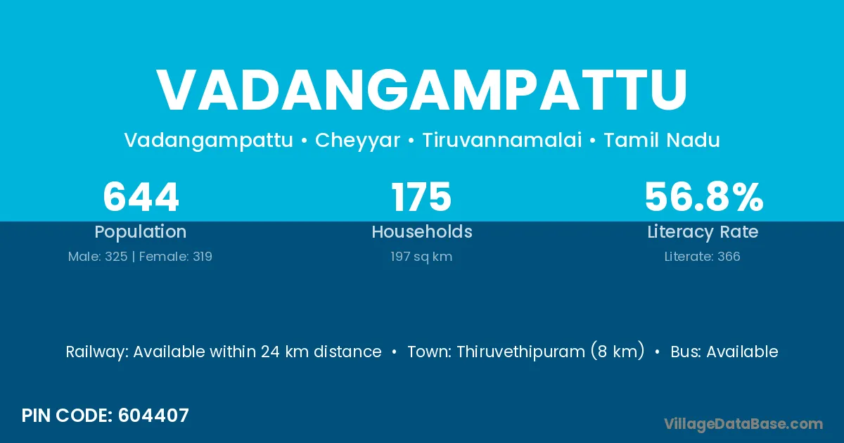 Thiruvethipuram (8 km) is the nearest town to Vadangampattu village for major economic activities and is located approximately 8 km away.