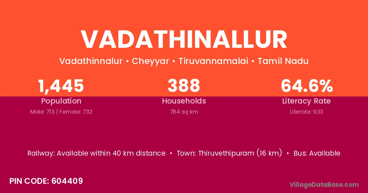 Vadathinallur village has a total population of 1,445 people, of which 713 are males and 732 are females.