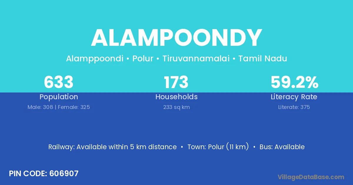 Polur (11 km) is the nearest town to Alampoondy village for major economic activities and is located approximately 11 km away.