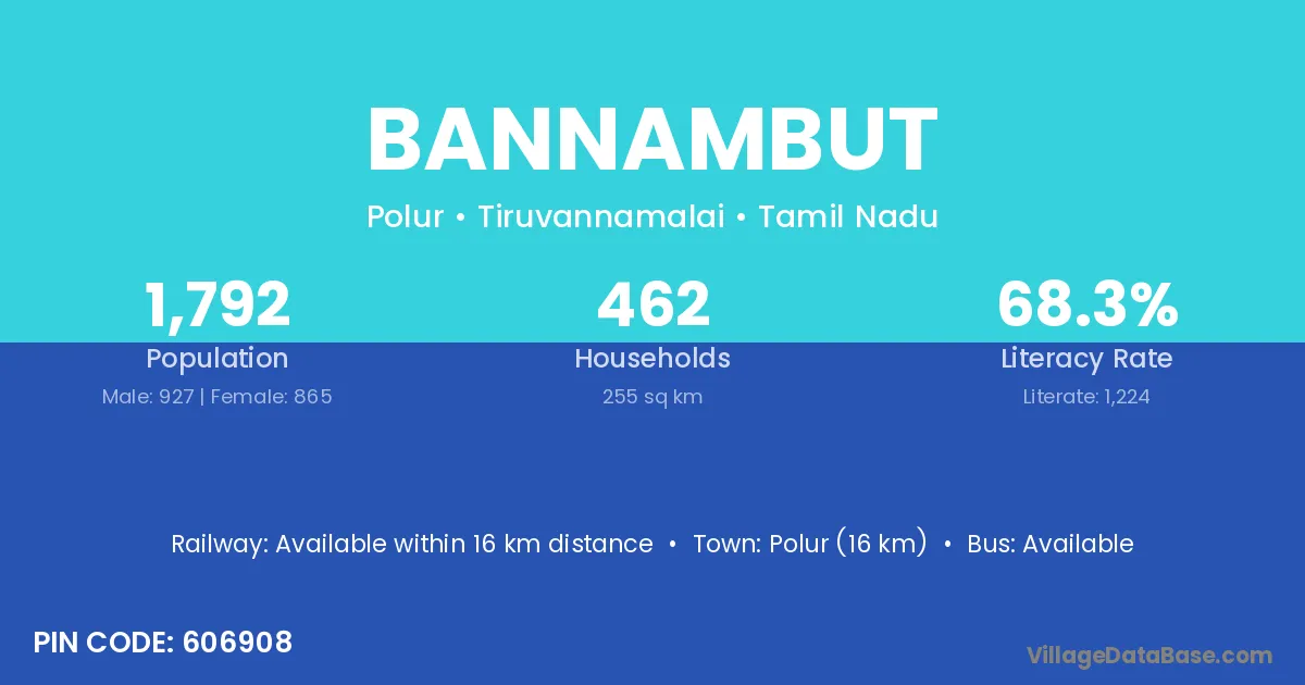 Polur (16 km) is the nearest town to Bannambut village for major economic activities and is located approximately 16 km away.