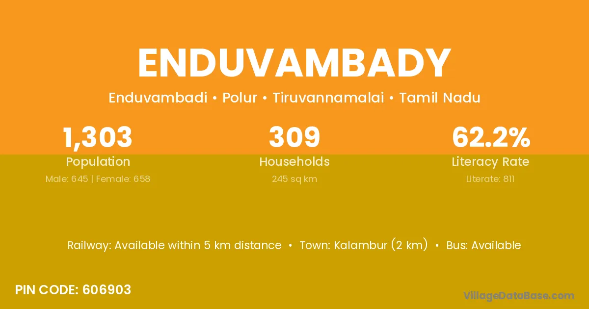 Kalambur (2 km) is the nearest town to Enduvambady village for major economic activities and is located approximately 2 km away.