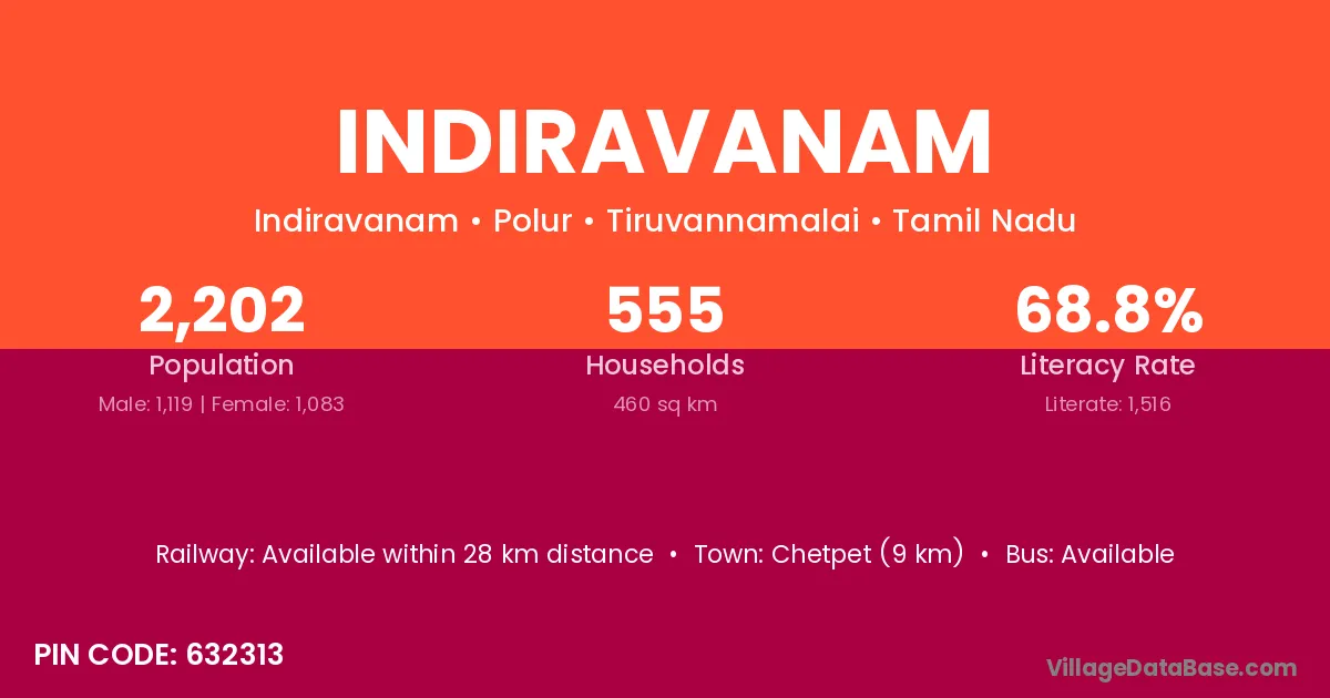 Indiravanam village has a total population of 2,202 people, of which 1,119 are males and 1,083 are females.