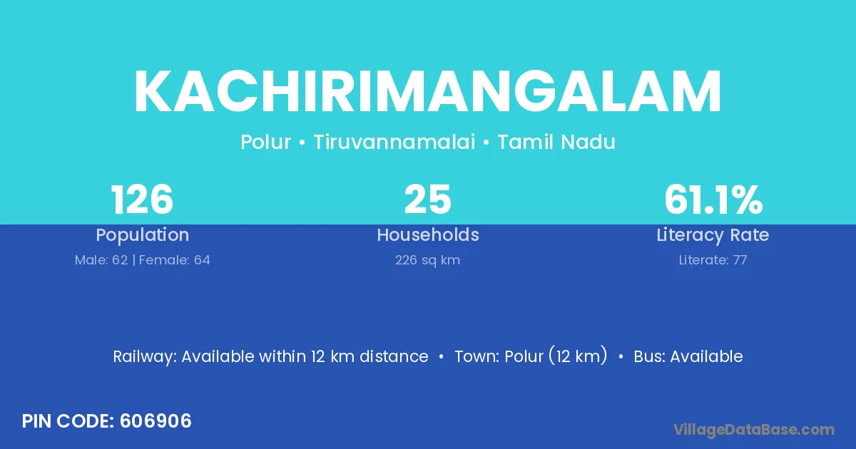 Kachirimangalam village has a total population of 126 people, of which 62 are males and 64 are females.
