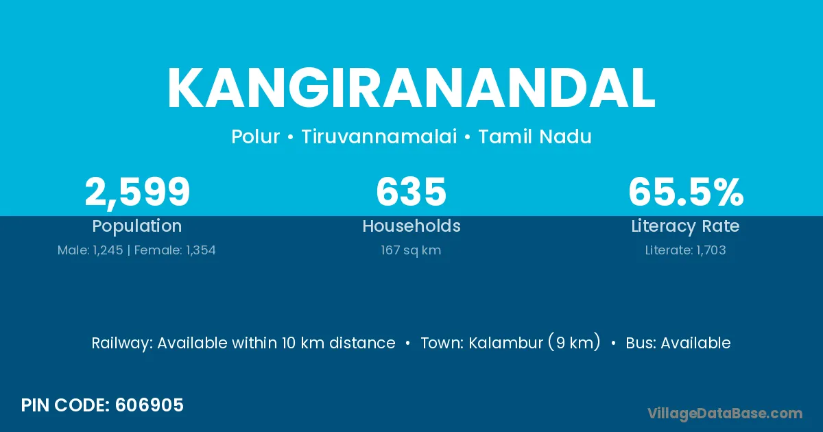 Kalambur (9 km) is the nearest town to Kangiranandal village for major economic activities and is located approximately 9 km away.