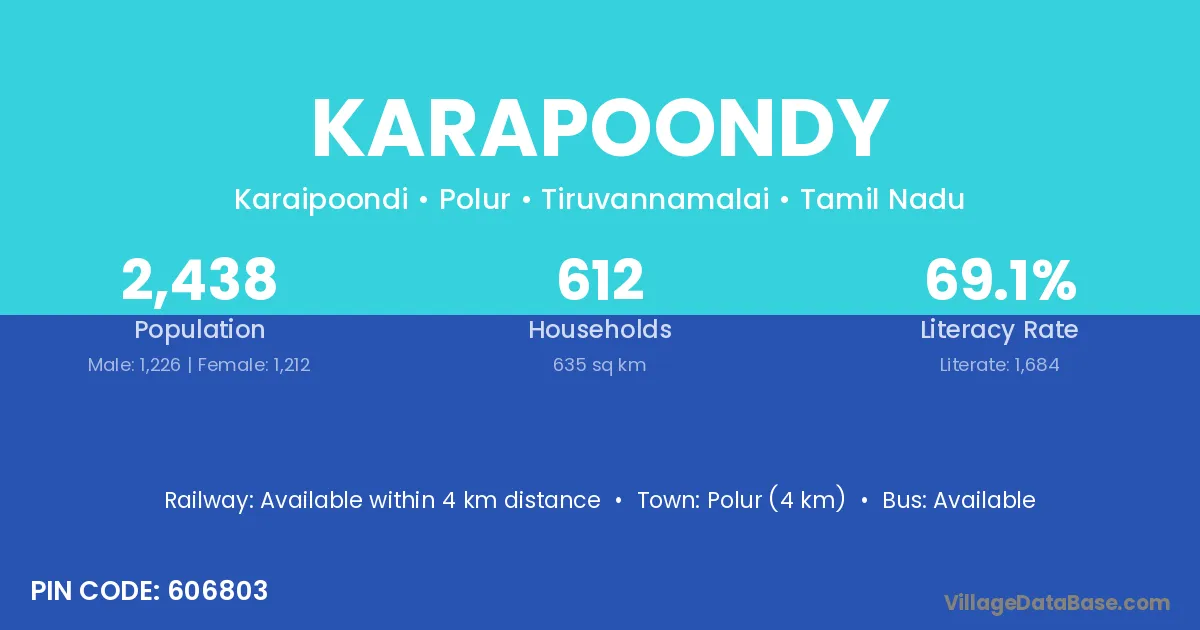 Polur (4 km) is the nearest town to Karapoondy village for major economic activities and is located approximately 4 km away.