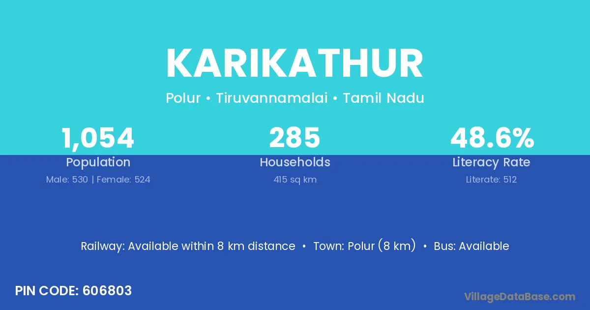 Polur (8 km) is the nearest town to Karikathur village for major economic activities and is located approximately 8 km away.