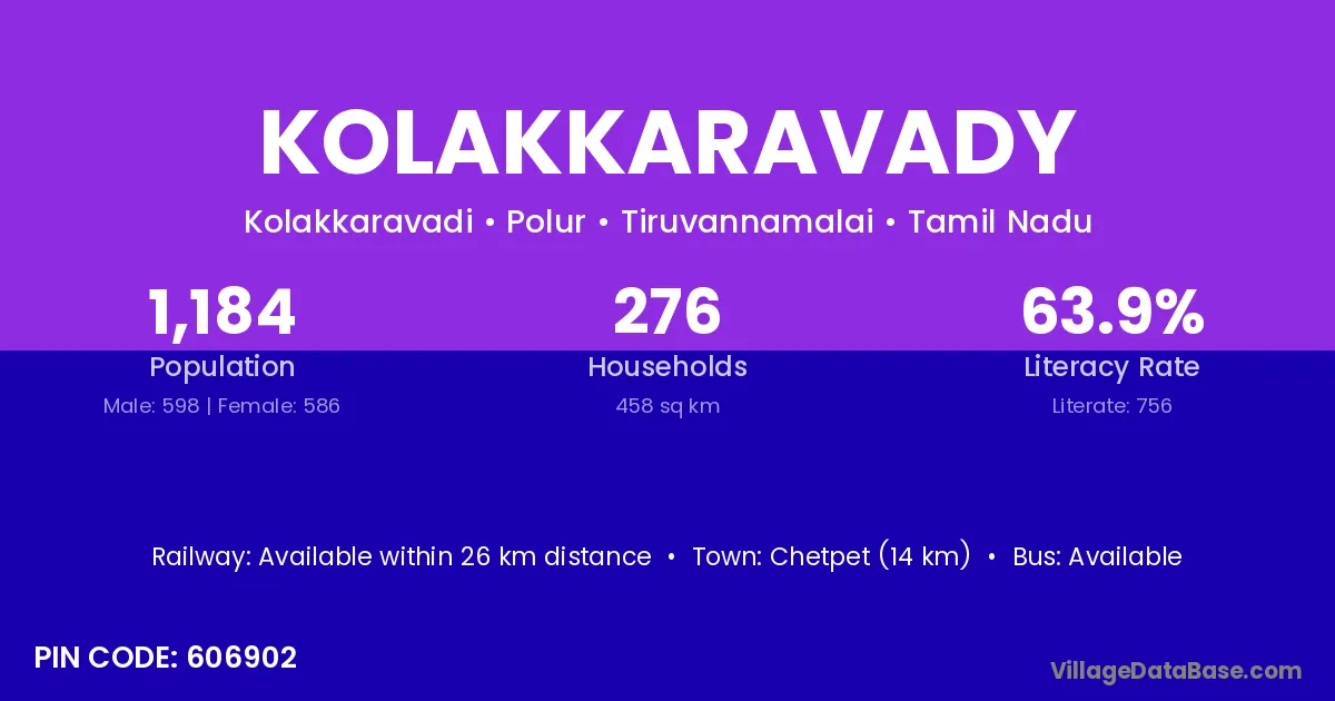 Chetpet (14 km) is the nearest town to Kolakkaravady village for major economic activities and is located approximately 14 km away.