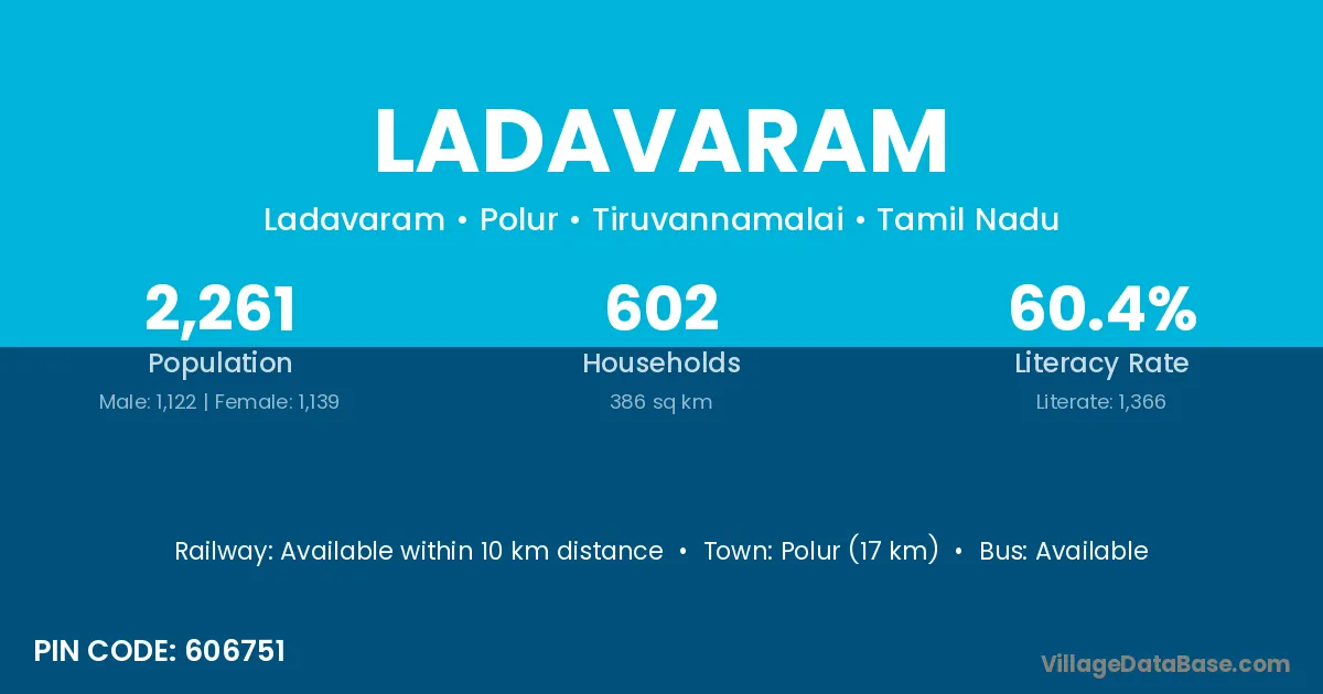 Polur (17 km) is the nearest town to Ladavaram village for major economic activities and is located approximately 17 km away.