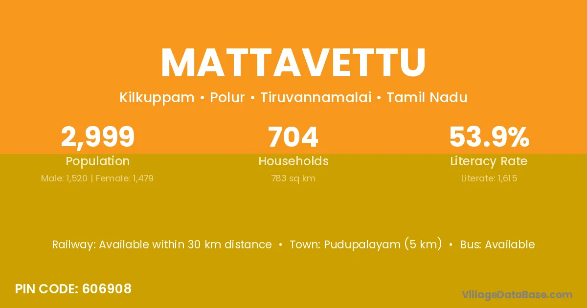 Pudupalayam (5 km) is the nearest town to Mattavettu village for major economic activities and is located approximately 5 km away.