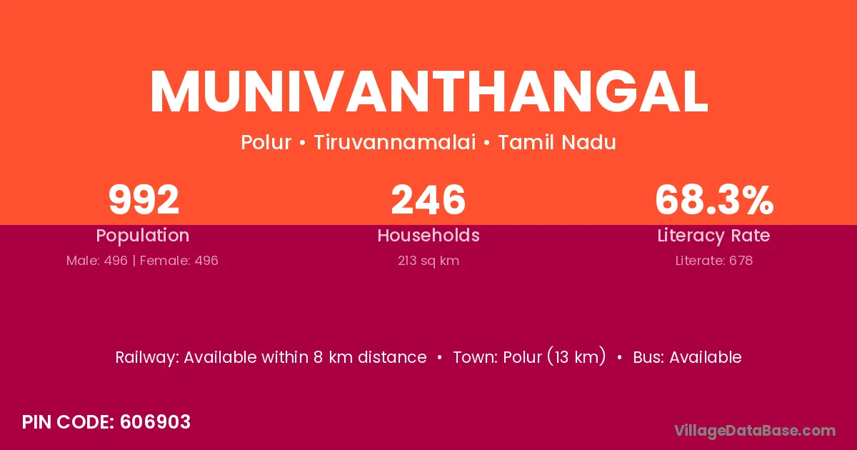 Munivanthangal village has a total population of 992 people, of which 496 are males and 496 are females.